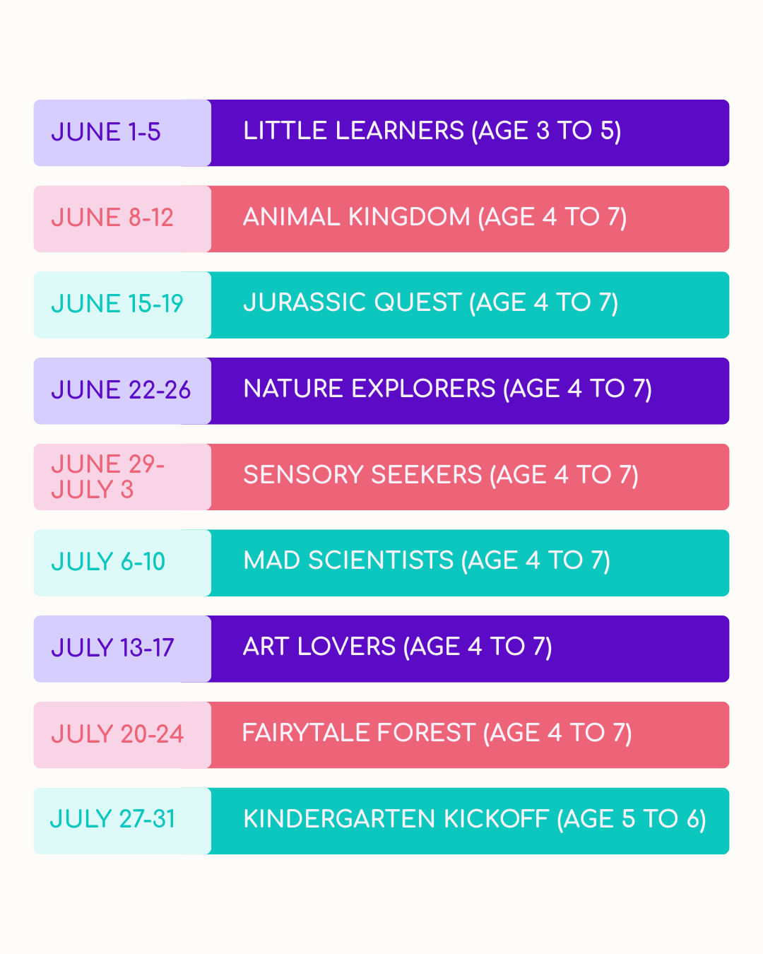 Little Learners Camp is for age 3 to 5. We accept 12 campers per session. Campers must be fully potty-trained and must turn 3 on or before June 1, 2026. We only offer half day camps for Little Learners. Little Learners Camp is only the first week of June (June 1-5, 2026).